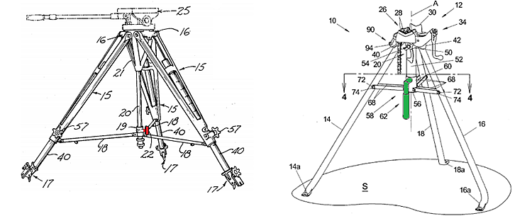 三脚を安全に片手で持ち運ぶためのハンドル(下図(右、緑))は、一見使い勝手が良いと思われるが、審判の判事は、引用特許の固定ネジ(下図(左、赤))でも、手首が挟まれ指を痛めながらであれば同様に使えることにより新規性を認めなかった。「While ... awkward, ... it does not appear to be impossible」とのことだった。